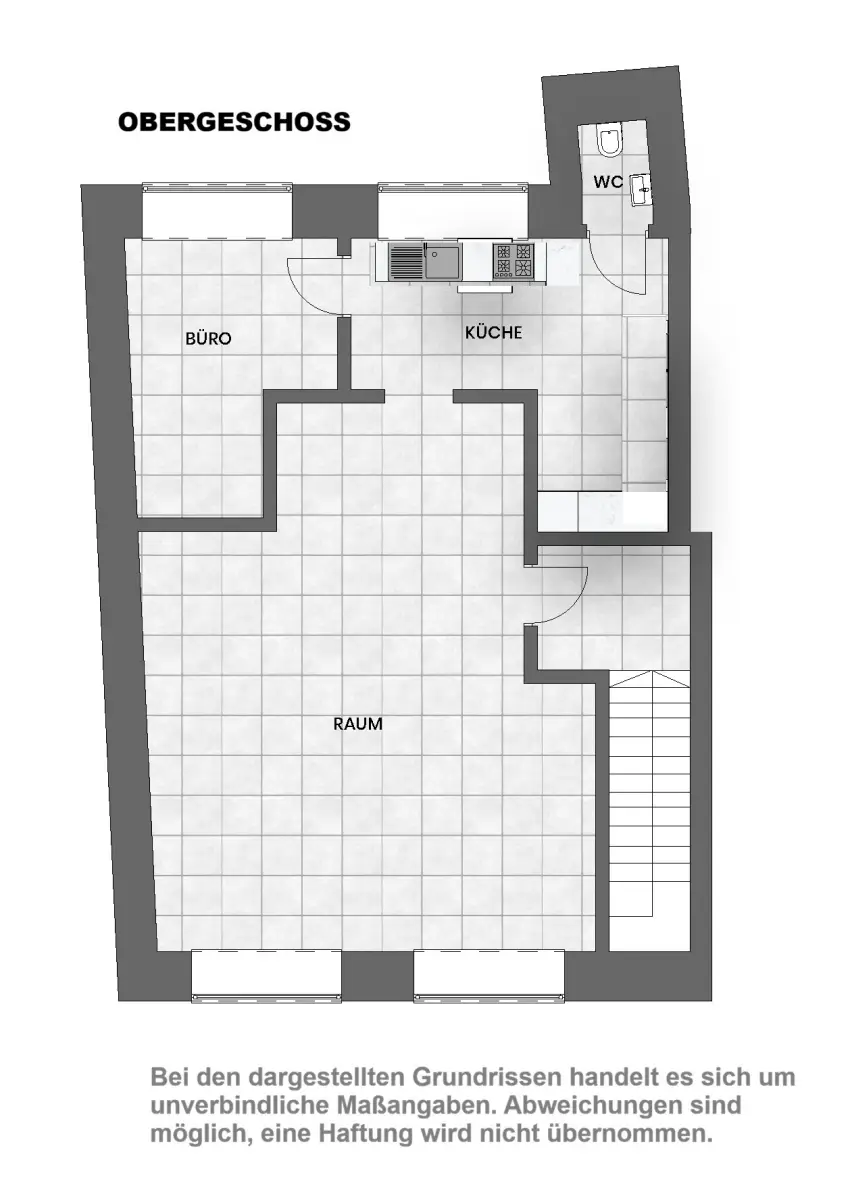 * Bürofläche mit Küche, Aufenthaltsraum und Toilette über den Treppenaufgang erreichbar