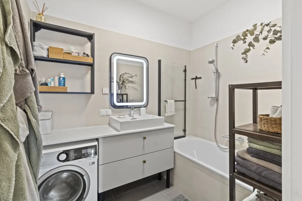 * Bad mit Dusche, Handwaschbecken und Badmöbel