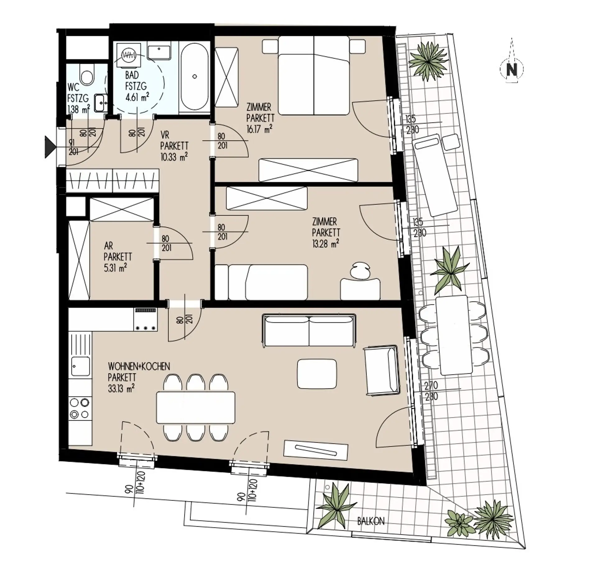 Die Wohnung bietet eine Wohnfläche von ca. 84,21 m² und einen Balkon von ca. 26,13 m², ideal zum Entspannen und Verweilen mit Weitblick über die Stadt.