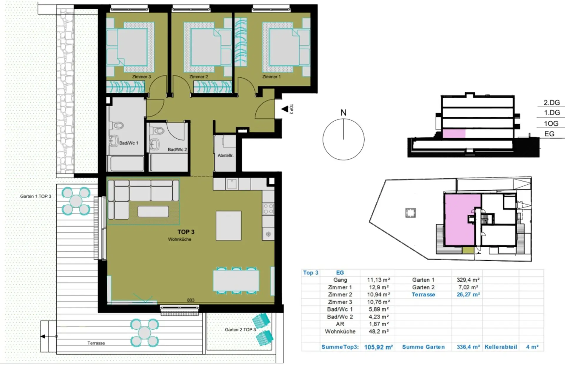 Nur 9 hochwertige Eigentumswohnungen mit durchdachten Grundrissen und 7 Tiefgaragenplätzen schaffen ein Zuhause mit Privatsphäre, Qualität und Nachhaltigkeit. Top 3 – Charmante VIER Zimmer Gartenwohnung im Erdgeschoss: