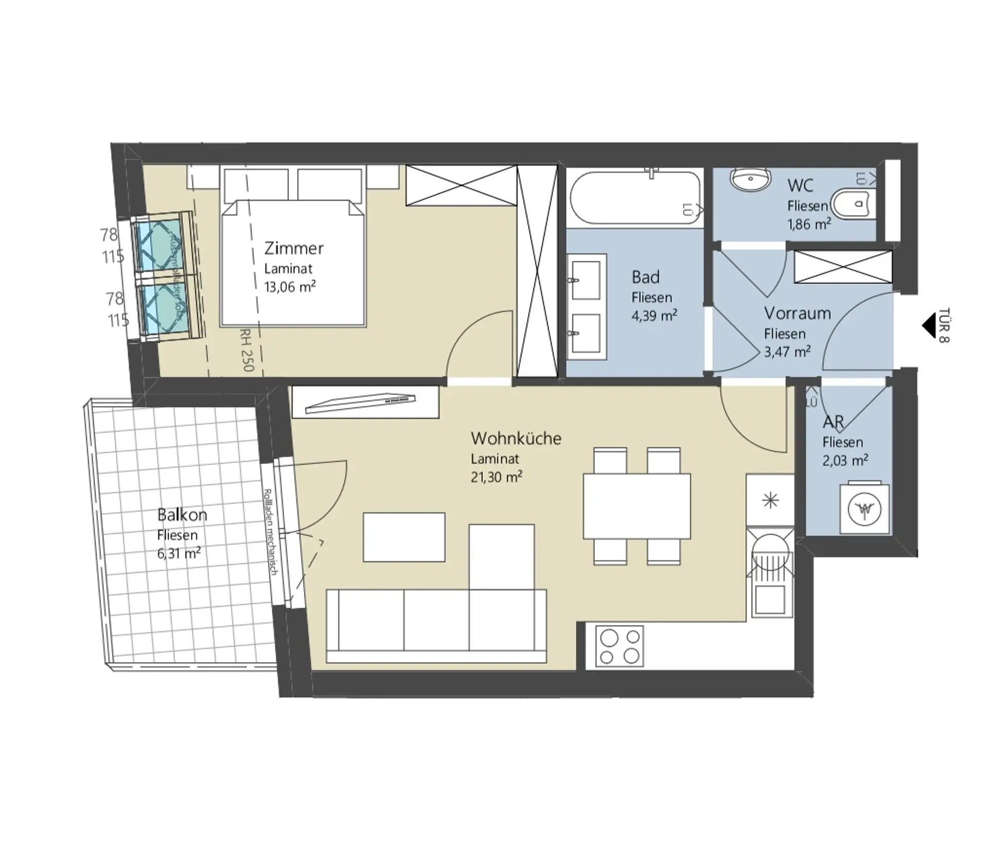 Die Wohnung mit einer Wohnnutzfläche von ca. 46,11 m² zzgl. einem Balkon von ca. 6,31 m² ist aufgeteilt wie folgt: + Vorzimmer