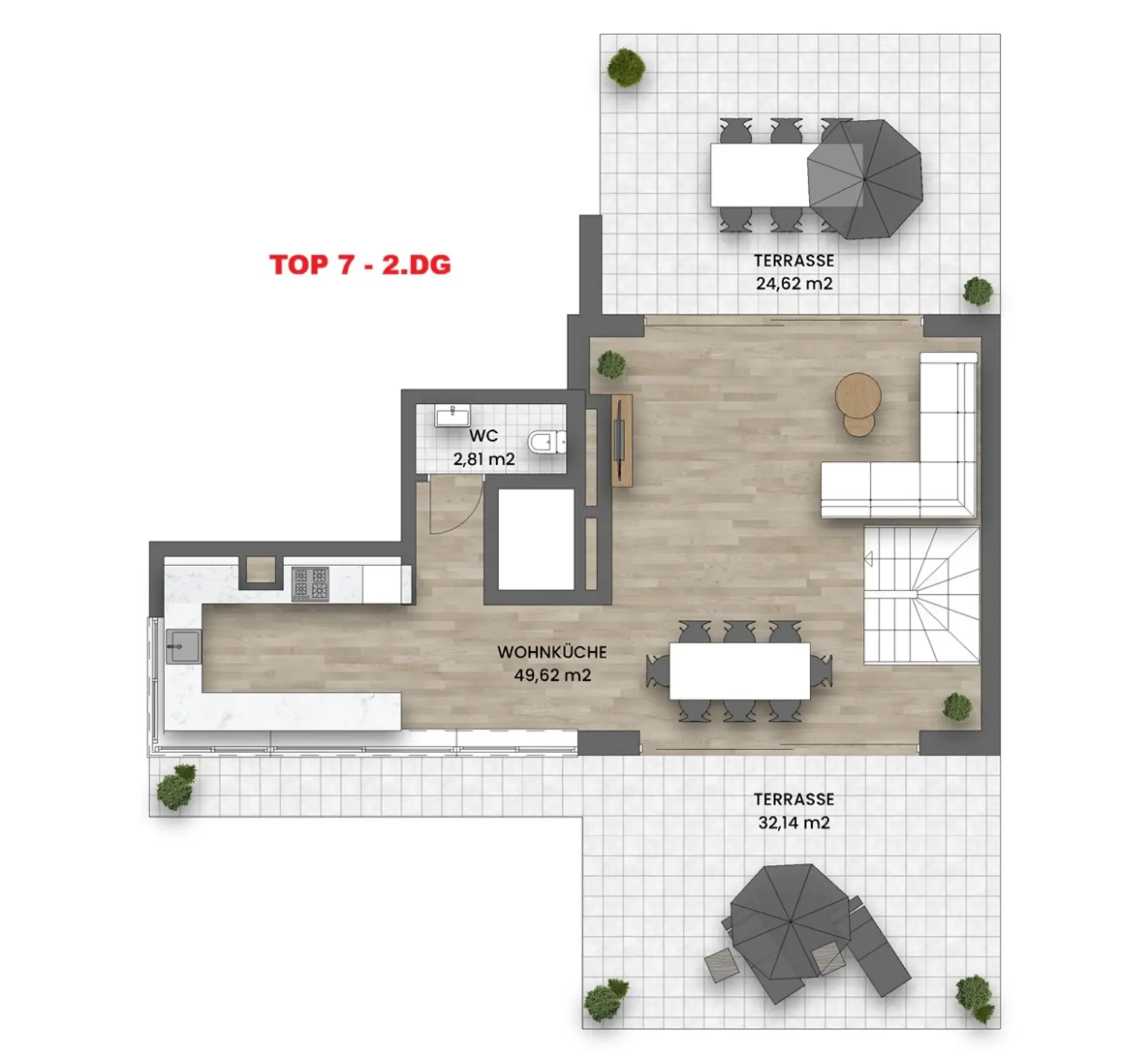 Nur 9 hochwertige Eigentumswohnungen mit durchdachten Grundrissen und 7 Tiefgaragenplätzen schaffen ein Zuhause mit Privatsphäre, Qualität und Nachhaltigkeit. Top 7 – Charmante VIER Zimmer MAISONETTE im Dachgeschoss: