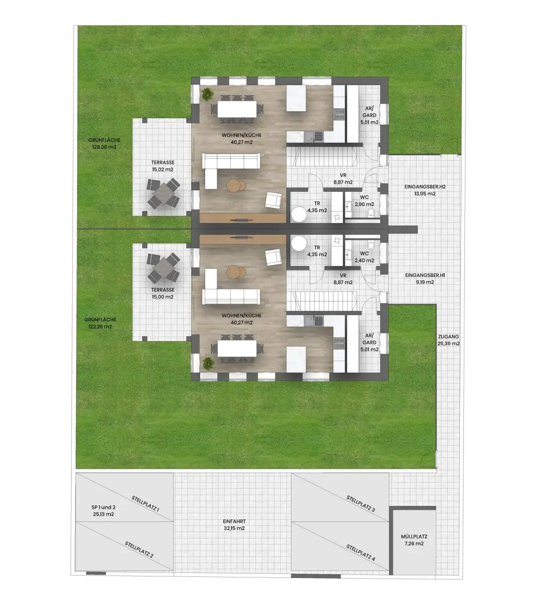 - Eigengarten und zwei Stellplätze pro Hausanteil