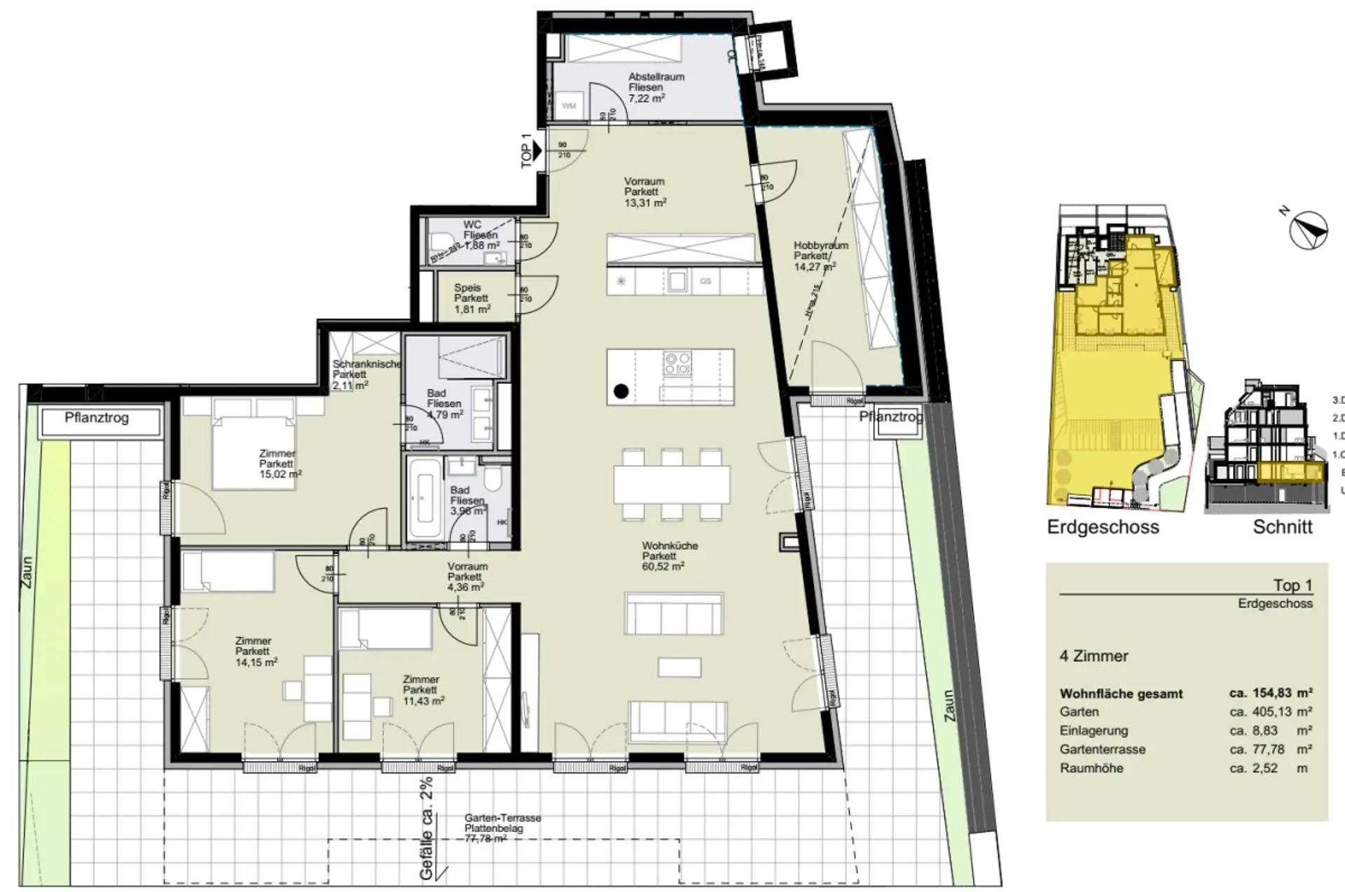 Stiege 3 Top 1 im Erdgeschoss: Diese exklusive und große FÜNF Zimmer Gartenwohnung auf ca. 154,83 m² Wohnfläche verfügt über einen grandiosen Eigengarten und eine atemberaubendeTerrasse.
