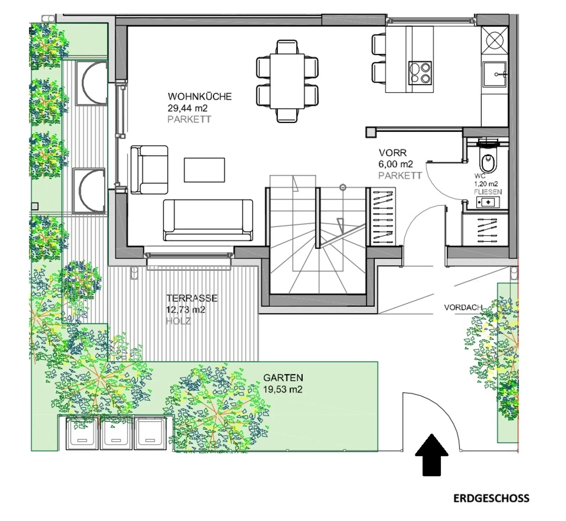 Vorraum, Wohnküche, Gäste-WC, Garten 19,53 m² und Terrasse ca. 12,73 m².