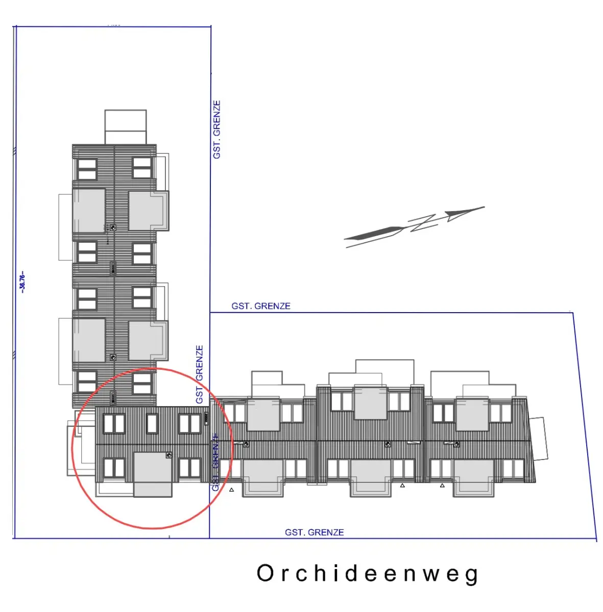 Die Häuser liegen am Orchideengweg in Wien 22, Neuessling, einer ruhigen und grünen Gegend.