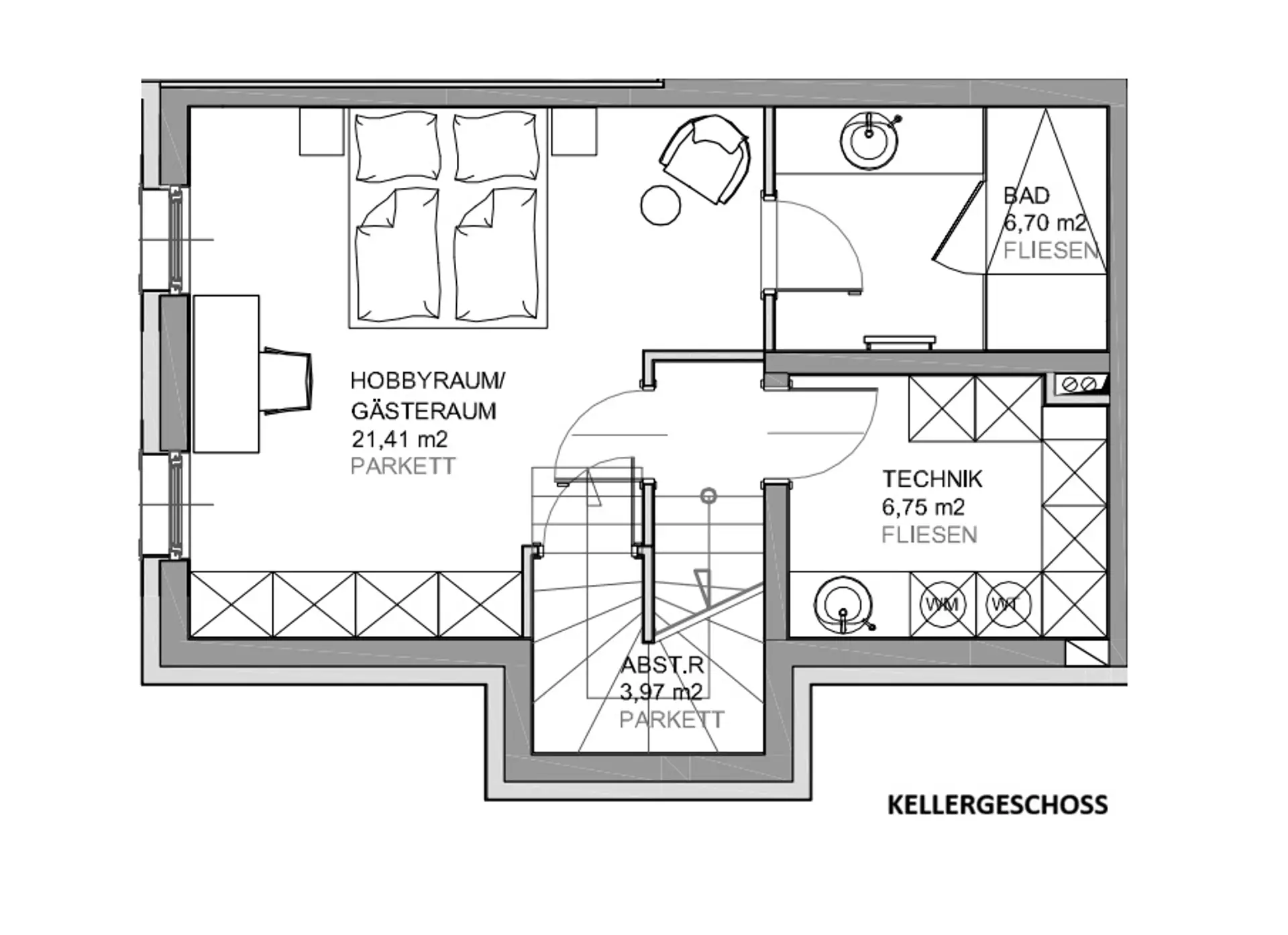 Gästezimmer, Bad mit Dusche, Technikraum und Abstellraum