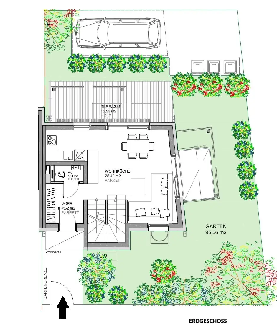Vorraum, Wohnküche, Gäste-WC, Garten von ca. 95,56 m², Terrasse von ca. 15,56 m².