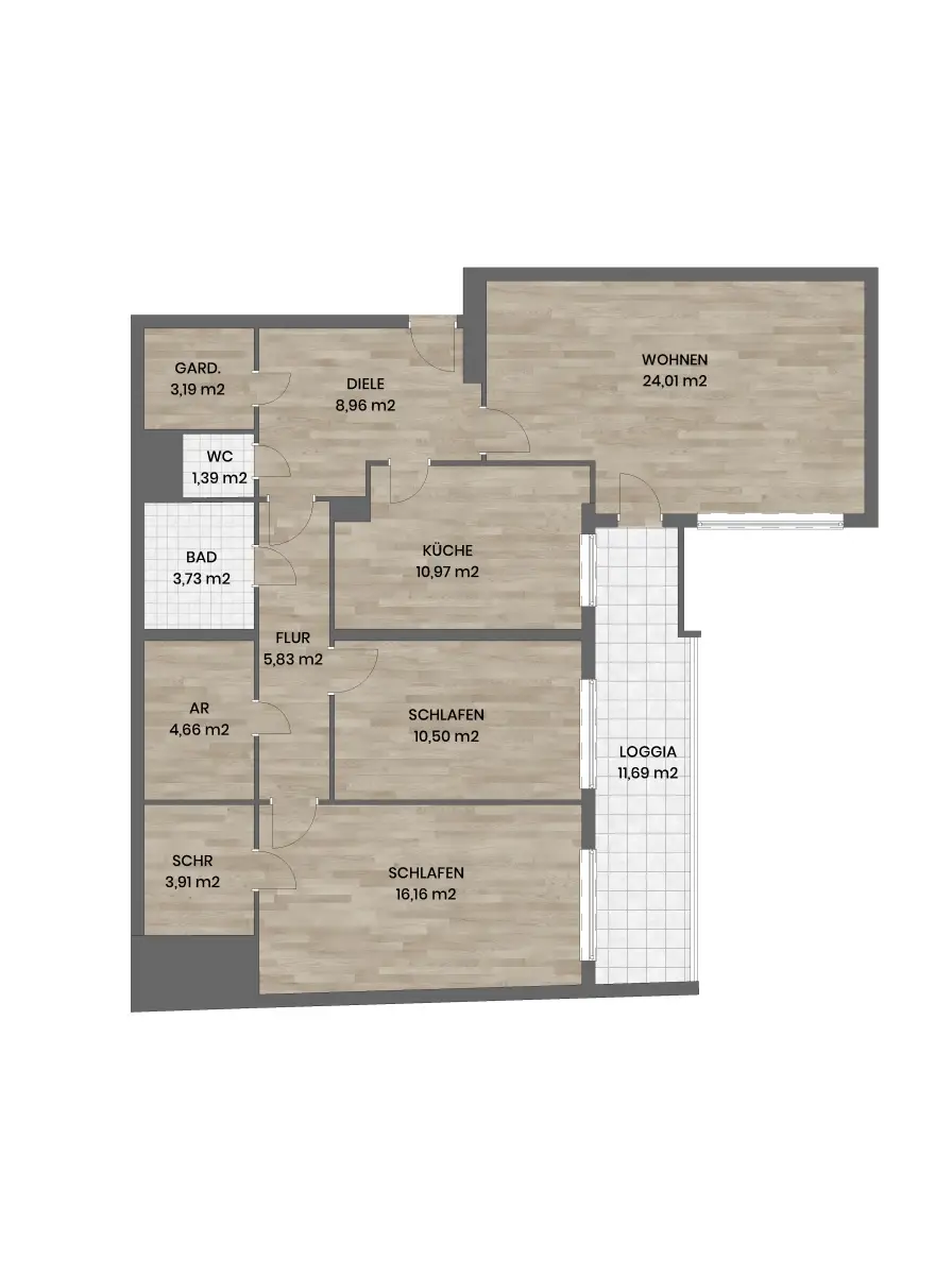 Die Wohnfläche von ca. 93,31 m² wird durch eine Loggia mit ca. 11,69 m² ergänzt und bietet somit ein angenehmes Wohngefühl mit viel Freiraum.