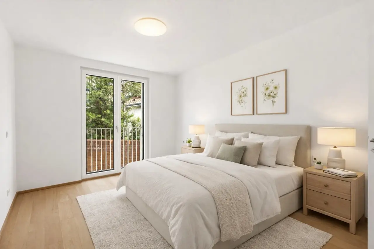 Die moderne Wohnanlage mit einer Tiefgarage wurde erst kürzlich fertiggestellt und überzeugt mit durchdachten Grundrisslösungen, hochwertiger Ausstattungsqualität und Freiflächen in Form von Eigengärten, Balkone, Loggien oder Dachterrassen.